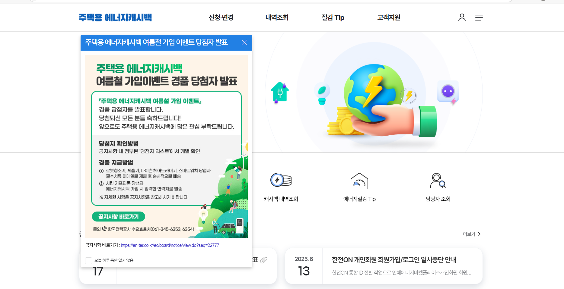 • 한전 고객센터(국번 없이 123) 또는 네이버에 ‘한전 에너지캐시백’ 검색 후 접속